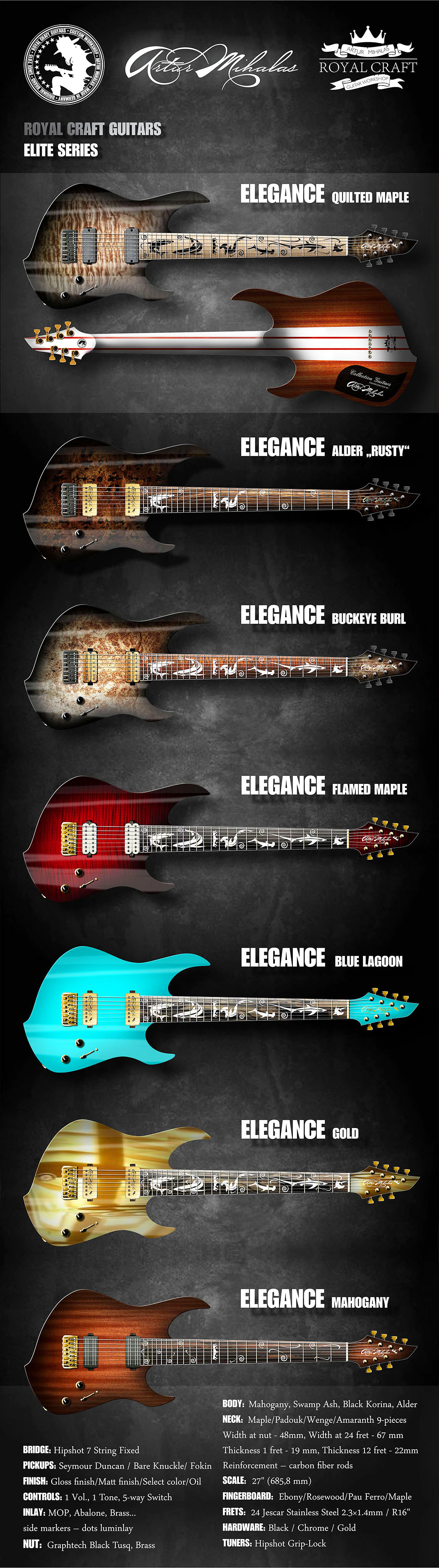 Fingerboard: Maple, 24 Jescar Stainless Steel Frets, Radius 20"
